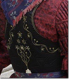 Festtagsmieder mit viel Peddigrohr-Steppmuster und reicher Goldstickerei auf schwarzer Seide