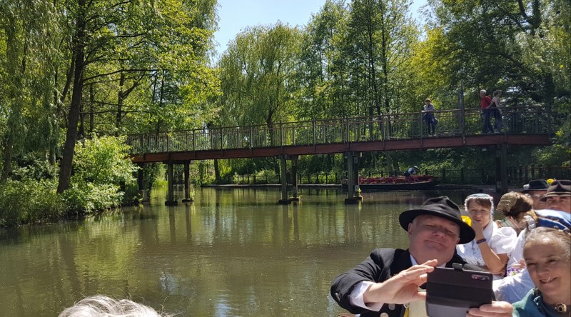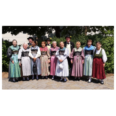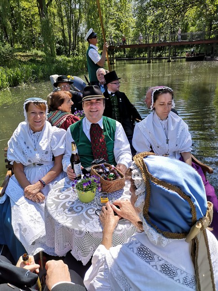 waren wir beim Deutschen Trachtentag in Lübben. Alle drei Jahre treffen sich deutsche Trachtenvereine zum Tanzen und Feiern. Altenburg 2013, Öhringen 2016 und heuer Lübben luden ein. Drei Münchner Vereine taten sich zusammen und ließen sich von Leo im großen Bus in den Spreewald chauffieren. Es war wunderbar: Die Sonne strahlte vom Himmel und schuf somit die Voraussetzung dafür, dass die open air Veranstaltung zu einem großen Erfolg wurde. Wir hatten drei Auftritte und wir tanzten richtig gut vor dem interessierten Fachpublikum. Selten hatten wir so viele und konzentierte Zuschauer bei Tanz und Parade. Besonders großartig fand ich es, dass wir Lecher mit den Schönen Münchnerinnen und mit der Riesengebirgstrachtengruppe zusammen einen richtig harmonischen und guten gemeinsamen Tanzauftritt hinlegten. Zusätzlich unterstützte uns Ingeborg Heinrichsen, die Choreografin vom Broatenbacher, vom Diessener und vom Wasenwalzer als Tänzerin. Sie wirbelte wie ein junges Mädchen über die Tanzfläche.