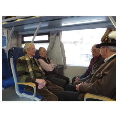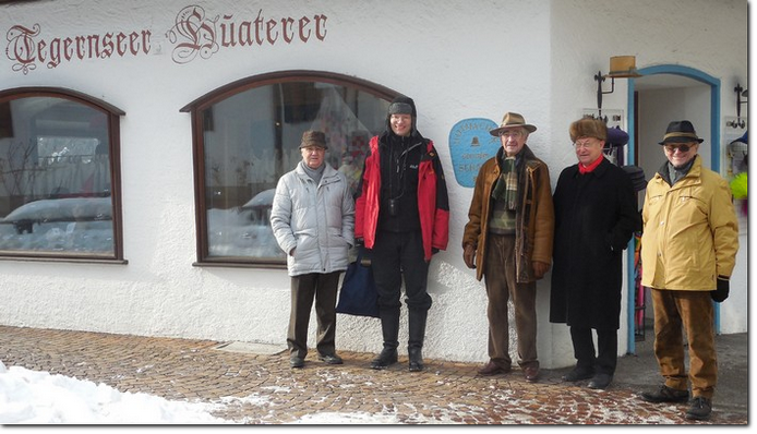 Am Samstag, dem 7. Februar 2015 treffen sich morgens um ¾9 Uhr ein paar Lechler Mannsbilder am Starnberger Flügelbahnhof in München um eine Fahrt mit der BOB (sofern sie wirklich fahrt) nach Tegernsee anzutreten. Grund: Oana braucht an Huat zum neua Gwand und a anderer hat sein Huat mit Lindenharz versaut – der braucht Reinigen (und wenn’s nimmer geht, dann muaß àà a neuer her)! Alloa traun sich aber die beiden nicht zum Huaterer Schätz in Tegernsee, daher nimmt a jeder 2 Mann Verstärkung mit, so san ma unsara sechse:da Hans Jürgen und da Robert als Huat-Besteller und (dem Alter nach) da Peter, da Otto, da Walter und da Sepp zur moralischen Unterstützung und Beratung– a lustiger Haufa!