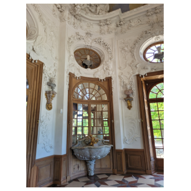 Zunächst besichtigten wir die Magdalenenklause, ein kurfürstlicher Rückzugsort mit Kapelle, welcher im Stil der damaligen Zeit als Ruine konzipiert worden ist und innen den Besucher mit schönen Muschelornamenten an Grottengestein verzückt (erbaut 1725-28 von Josef Effner).