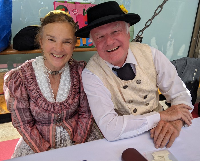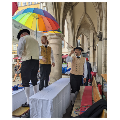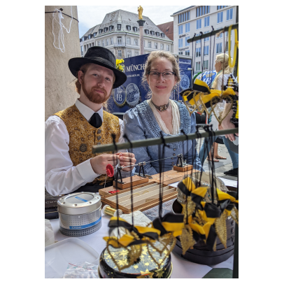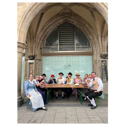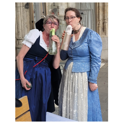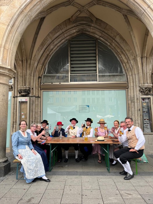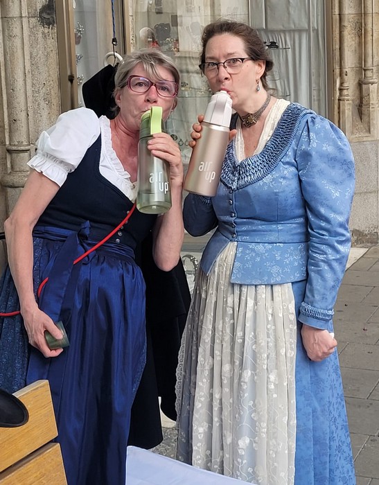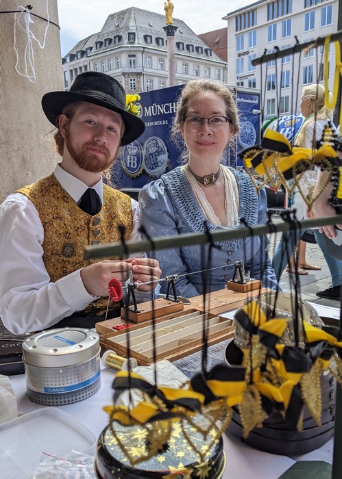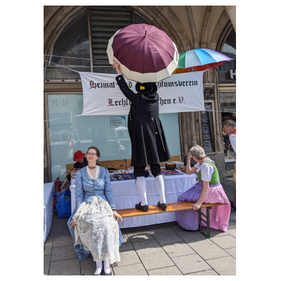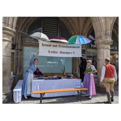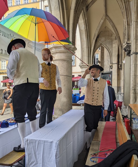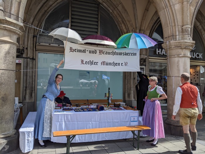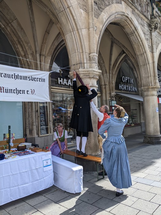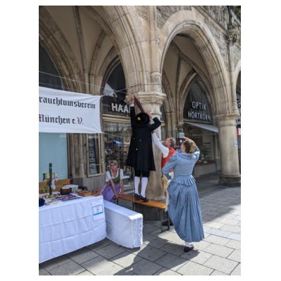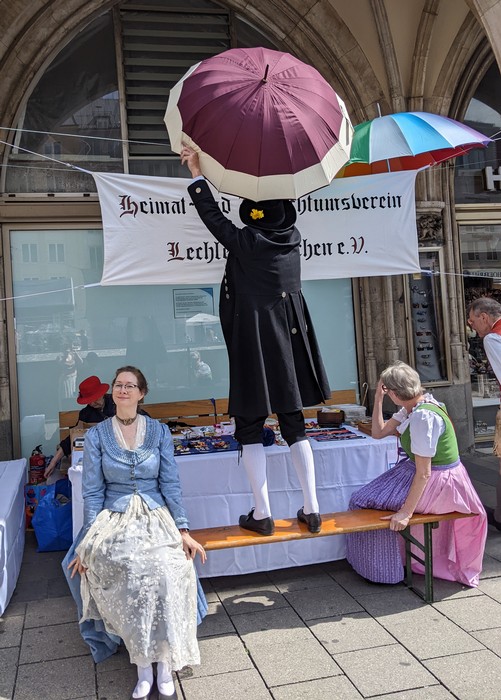 Heuer muss ich dem Homepagebesucher einmal den Aufbau unseres Standes unter den Rathausarkaden näher beschreiben. Spätestens ab Mittag brennt nämlich bei schönem Wetter den ganzen Nachmittag lang die Sonne auf unseren Tisch und die Bänke herunter. In unseren Miedern, Hosen und Röcken wird es da ganz schnell unerträglich heiß. Würden wir Sonnenschirme aufstellen, sähe man unser HBV Lechler Banner nicht mehr und der Durchgang zur U-Bahn wäre unzulässig verengt. Also steigen wir auf die Bänke, sichern sie vor dem Umkippen, spannen trickreich Seile  um und zwischen die Säulen und befestigen große Regenschirme so, dass sie uns in gekippter Neigung schönen Schatten spenden.