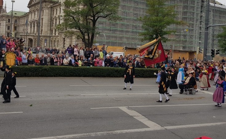 Kein Regen, kein Wind und eine Startnummer, die uns Gelegenheit zum "Ausschlafen" gegeben hat. Das hat sich allerdings beim Anschauen der zuhause aufgezeichneten Direktübertragung des Festzuges im Fernsehen als nachteilig herausgestellt. Wir marschierten erst nach dem Ende der Sendezeit an der Kamera vorbei. Dabei wären wir dieses Mal wirklich einmal alle gefilmt worden. Kein Interview und kein Kamaraschwenk zu den Politikern verhinderte den Blick auf die Lechlergruppe. Das konnten allerdings nur Eingeweihte sehen, die wussten, dass das Bayerische Fernsehen den Zug in voller Länge im Abendprogramm noch einmal im Programm hat.