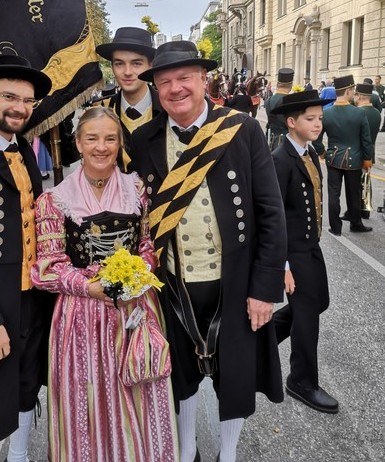 Egal, es ist jedes Jahr ein großes Erlebnis zuerst in freudiger Erwartung am Aufstellungsplatz die anderen Trachtler, die vielen Pferdegespanne und schön geschmückten Prachtwägen abzuschreiten und dann die siebeneinhalb Kilometer bis zur Wiesn hinter unseren Fahnenträgern herzulaufen und die Daumen zu drücken, dass keinem der Drei die Kraft ausgeht beim Tragen unserer 31 kg schweren Fahne. Felix, du hast dich bei deinem ersten Einsatz als Fahnenträger sehr sehr gut geschlagen.