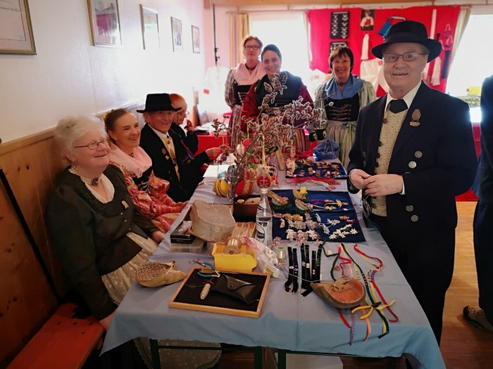 Alle zwei Jahre lädt der Isargau im Frühjahr zum Trachtenmarkt ins Pelkovenschlösserl in Moosach ein. Es gibt alles, was man als Trachtler brauchen kann, handgefertigt. Heuer war der Markt vor Ostern, weshalb wir neben unserem normalen Sortiment viele schöne Ostereier anbieten konnten. Fleißig fädelten wir Perlen, bogen wir Drähte in Form und fertigten wir Kämme, Haarspangerl, Haarnadeln, Freundschaftsbandel, Broschen und Anhänger. Evi stellte in gewohnt souveräner Weise in zwei Vortragsrunden unser Münchner Gwand auf seinem historischen Hintergrund einer interessierten Zuhörerschaft vor.