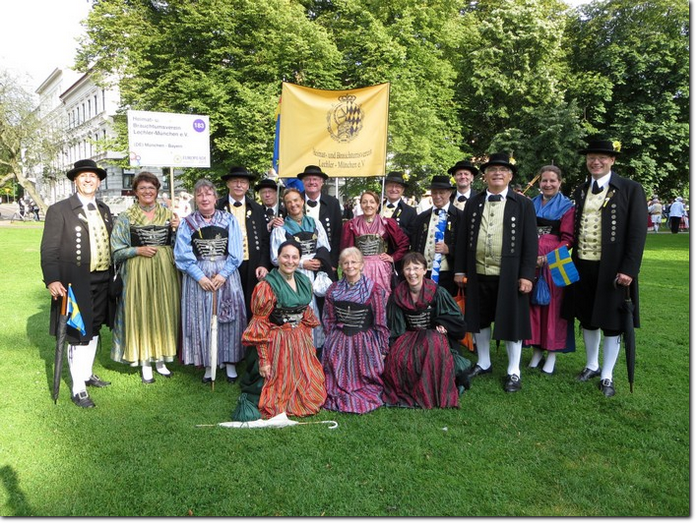 Wir 20 Vereinsmitglieder repräsentierten uns so oft wie möglich im Lechler Gwand. Zu Ausflügen und Besichtigungen flanierten wir in der boarischen Tracht durch Schonen und die wunderschöne Gastgeberstadt am Öresund. Mir wollten ja schließlich was her machen. Beim Tanzen in der Arena von Helsingborg hätte man ja schon ein bisserl einen Bammel bekommen können, bei mindestens 4000 sachkundigen Zuschauern. Aber, dank Uli und Martin, ist alles gut gegangen.