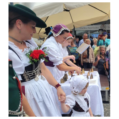 Die Besichtigung des vorgesehenen Tanzplatzes vor dem Elise-Aulinger-Brunnen ernüchterte so manche übermotivierte Protagonistin anfangs. Seeehr, seehr wenig Platz zum Tanzen auf holprigem, leicht abschüssigem Gelände. Aber unsere Gautanzleiterin Vroni platzierte uns geschickt zwischen dem Brunnen, den Pflanzkübeln, den zahlreichen Sitzglegenheiten für Marktbesucher, einem riesigen rollenden Verkaufswagen und den Zuschauermassen. So konnten die Roagerpaare im Miesbacher Gwand, die RTG-ler in ihrer Schlesischen Tracht und die Lechler im Münchner Gwand das Trachtengau München und Umgebung bestens repräsentieren. Wir gaben ein wunderschönes tanzendes Bild ab. Profis, wie wir sind, ließen wir uns nicht einmal durch eine wilde Verbrecherjagd ablenken, die sich die Polizei mit Uhrenräubern in nächster Nähe lieferte oder durch den Polizeihubschruber, der das Geschehen lautstark aus der Luft verfolgte. Auch Fridays for Future wählte den Viktualienmarkt als Demonstrationsort.