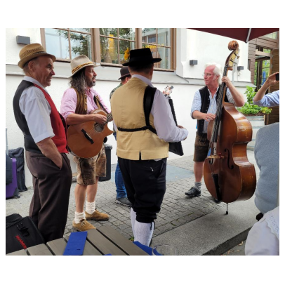 Das beste war dann das Fest nach dem Fest. Beim Pschorr trafen sich nämlich sämtliche Musikanten und nachdem der Sängerkreis Ottobrunn zum Singen angefangen hatte und unser Martin seine Zieharmonika auspackte, stimmten auch die anderen Künstler mit ihren Stimmen und Instrumenten ein. Europeade-mäßig schee war's, bis in die Nacht hinein z'München am Viktualienmarkt.