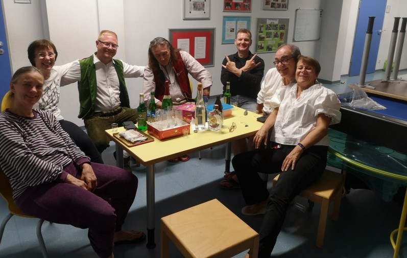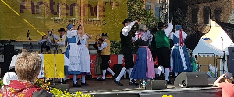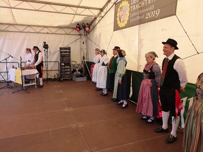 waren wir beim Deutschen Trachtentag in Lübben. Alle drei Jahre treffen sich deutsche Trachtenvereine zum Tanzen und Feiern. Altenburg 2013, Öhringen 2016 und heuer Lübben luden ein. Drei Münchner Vereine taten sich zusammen und ließen sich von Leo im großen Bus in den Spreewald chauffieren. Es war wunderbar: Die Sonne strahlte vom Himmel und schuf somit die Voraussetzung dafür, dass die open air Veranstaltung zu einem großen Erfolg wurde. Wir hatten drei Auftritte und wir tanzten richtig gut vor dem interessierten Fachpublikum. Selten hatten wir so viele und konzentierte Zuschauer bei Tanz und Parade. Besonders großartig fand ich es, dass wir Lecher mit den Schönen Münchnerinnen und mit der Riesengebirgstrachtengruppe zusammen einen richtig harmonischen und guten gemeinsamen Tanzauftritt hinlegten. Zusätzlich unterstützte uns Ingeborg Heinrichsen, die Choreografin vom Broatenbacher, vom Diessener und vom Wasenwalzer als Tänzerin. Sie wirbelte wie ein junges Mädchen über die Tanzfläche.