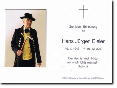 Hans Jürgen Bieler kam im Herbst 2013 zu uns Lechlern. Seine Begeisterung und sein Wohlwollen dem Verein gegenüber war uns allen – trotz seiner ruhigen Art - schnell bewusst geworden. Bald hat er sich das Münchner Gwand zugelegt, das er immer mit großer Freude und Stolz getragen hat. Die Lechler Gewohnheit, die Hutbestellung als Anlass zu nehmen, einen gemeinsamen „Huatererausflug“ nach Tegernsee zu unternehmen, gefiel ihm außerordentlich. Auch seinen großen Wunsch, einmal am Trachten- und Schützenzug teilzunehmen, konnte er sich 2015 erfüllen. Gerne hat er an den Vereinsveranstaltungen teilgenommen, immer wieder auch begleitet von seiner Frau Karin.