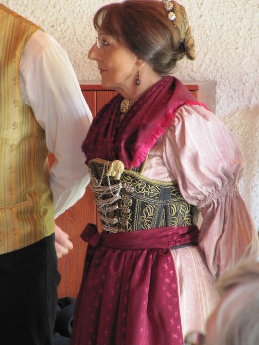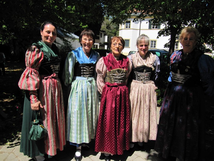 Leider ist der Festredner nicht mehr anwesend gewesen, als die Evi dem Publikum unser Gwand vorgestellt hat. Da hätte er dazulernen können, dass die Gewänder der Münchner Bürger zu den Zeiten von Max I und Ludwig I, die von uns in erneuerter Form getragen werden, existierenden historischen Vorbildern nachgearbeitet werden.