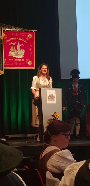 fand die Landesverbandstagung des Bayerischen Trachtenverbandes in Unterföhring statt. Der Trachtengau München und Umgebung war Ausrichter, weshalb auch wir Lechler bei der Planung und Gestaltung gefragt waren. Im Vorfeld entstanden die wunderschönen Münchner Kindl als Tischschmuck für die Vereinsvertreter oder die Sackerl für die Krautköpfe, die jeder Besucher als Abschiedsgeschenk mitbekam. 60 Kuchen waren von fleißigen Händen gebacken und verkauft worden, die Mittagessen mussten zügig verteilt und wieder abgetragen werden, und das Bürgerhaus in Unterföhrung musste wunderschön mit Blumen dekoriert werden, damit die Kulisse für die Redner, für die Tanzauftritte am Heimatabend und auch für den festlichen Gottesdienst am Sonntag in der nüchternen Räumlichkeit prächtige Bilder liefern konnte.
