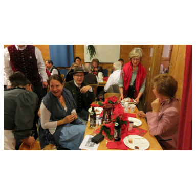 Die Feier hat besinnlich begonnen, mit Weihnachtsliedern, bei denen alle mitgesungen haben und die von Christl und Otto begleitet worden sind. Zwischendurch haben wir noch weihnachtliche Geschichten gehört. Es war sehr stimmungsvoll.